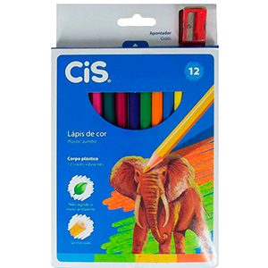 Lápis de cor CIS Jumbo (Gigante), cores vivas, grafite mais resistente, corpo plástico e sextavado. Grátis um apontador. Estojo com 12 cores.
